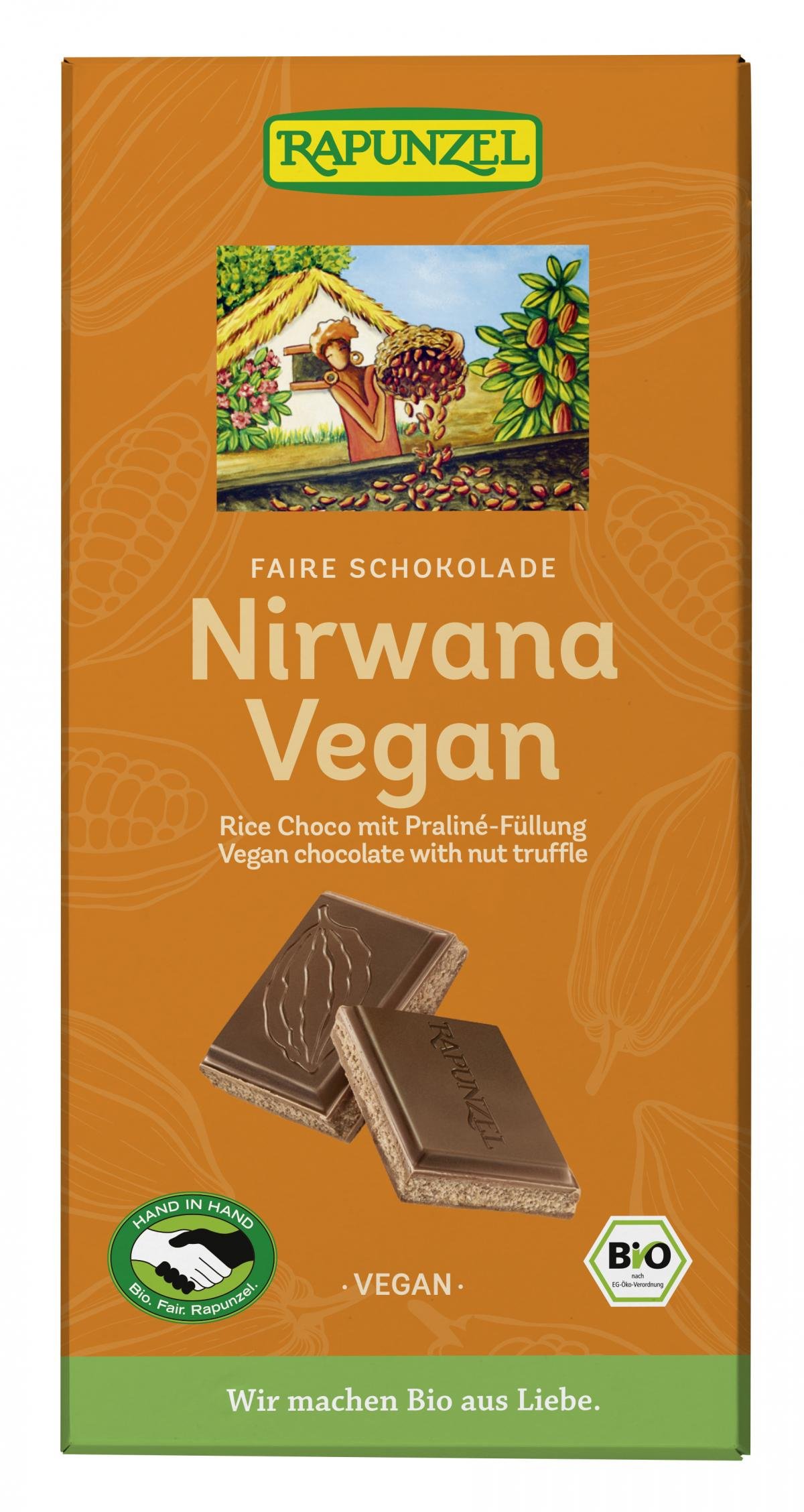Nirwana Vegan ist die Schokolade für alle Genießer und kommt dabei ganz ohne Milchpulver aus. Die feine, edle Praliné-Füllung schmilzt cremig zart auf der Zunge. Rapunzel Schokolade steht für höchste Qualität nach Schweizer Herstellertradition verbunden mit wertvollen fair gehandelten Zutaten aus ökologischem Anbau. Das intensive Conchieren ist neben den wertvollen Rohstoffen das eigentliche Geheimnis des wahren Schokoladengenusses. Durch die Kunst des Conchierens entwickelt sich der anfänglich noch verborgene Reichtum an kakaoeigenen Aromen Stufe um Stufe bis zur vollen Entfaltung. Gleichzeitig entsteht vollkommene Feinheit und der unvergleichlich zarte Schmelz.